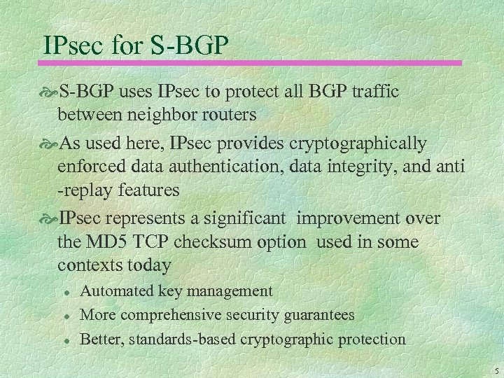 S-BGP Design Overview S-BGP makes use of: l l l IPsec to secure point-to-point communication of BGP control traffic Public Key Infrastructure to provide an authorization framework representing prefix holders and owners of AS #’s Attestations (digitally-signed data) to represent authorization information S-BGP requires routers to: l l Generate an attestation when generating an UPDATE for another S-BGP router Validate attestations associated with each UPDATE received from another S-BGP router 4