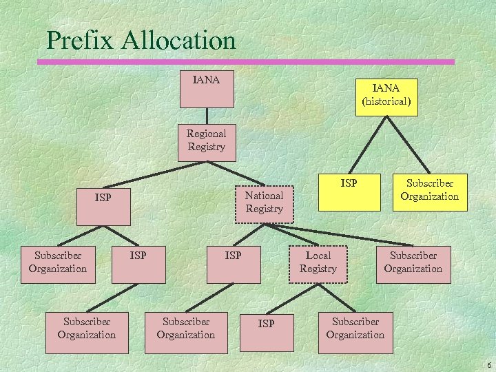 Prefix Allocation IANA (historical) Regional Registry ISP National Registry ISP Subscriber Organization Local Registry ISP Subscriber Organization 6