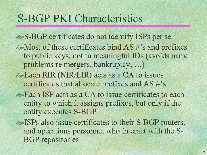 A PKI for S-BGP Public Key (X. 509) certificates are issued to ISPs and subscribers to identify AS # owners and prefix holders, using RFC 3779 syntax Prefixes and public keys in certificates are used to verify authorization of address attestations Address attestations, AS #’s and public keys from certificates are used as inputs to verification of UPDATE messages The PKI does NOT rely on any new organizations that require trust; it just makes explicit and codifies the relationships among regional, national and local registries, ISPs, and subscribers 8