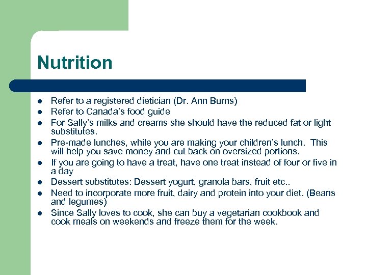 Nutrition l l l l Refer to a registered dietician (Dr. Ann Burns) Refer to Canada’s food guide For Sally’s milks and creams she should have the reduced fat or light substitutes. Pre-made lunches, while you are making your children’s lunch. This will help you save money and cut back on oversized portions. If you are going to have a treat, have one treat instead of four or five in a day Dessert substitutes: Dessert yogurt, granola bars, fruit etc. . Need to incorporate more fruit, dairy and protein into your diet. (Beans and legumes) Since Sally loves to cook, she can buy a vegetarian cookbook and cook meals on weekends and freeze them for the week.
