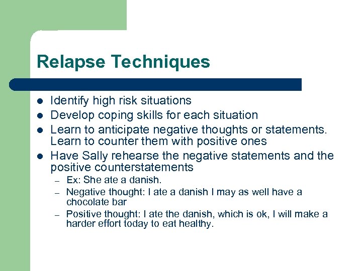 Relapse Techniques l l Identify high risk situations Develop coping skills for each situation Learn to anticipate negative thoughts or statements. Learn to counter them with positive ones Have Sally rehearse the negative statements and the positive counterstatements – – – Ex: She ate a danish. Negative thought: I ate a danish I may as well have a chocolate bar Positive thought: I ate the danish, which is ok, I will make a harder effort today to eat healthy.