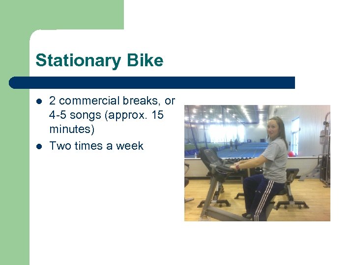 Stationary Bike l l 2 commercial breaks, or 4 -5 songs (approx. 15 minutes) Two times a week