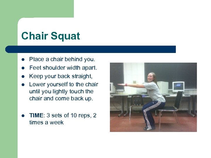 Chair Squat l l l Place a chair behind you. Feet shoulder width apart. Keep your back straight, Lower yourself to the chair until you lightly touch the chair and come back up. TIME: 3 sets of 10 reps, 2 times a week