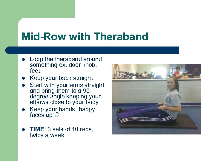 Mid-Row with Theraband l l l Loop theraband around something ex: door knob, feet. Keep your back straight Start with your arms straight and bring them to a 90 degree angle keeping your elbows close to your body Keep your hands “happy faces up” TIME: 3 sets of 10 reps, twice a week