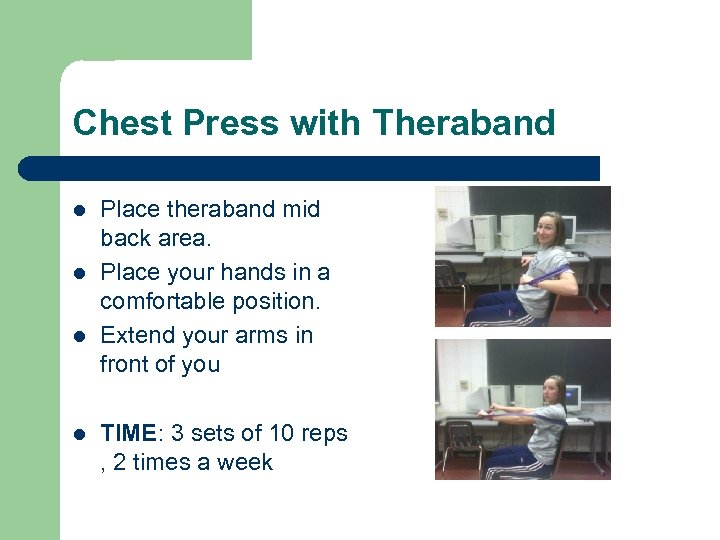 Chest Press with Theraband l l Place theraband mid back area. Place your hands in a comfortable position. Extend your arms in front of you TIME: 3 sets of 10 reps , 2 times a week