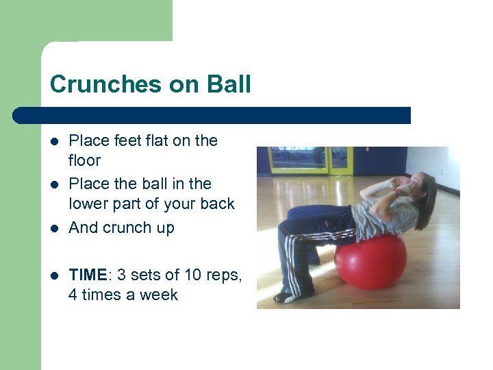 Crunches on Ball l l Place feet flat on the floor Place the ball in the lower part of your back And crunch up TIME: 3 sets of 10 reps, 4 times a week