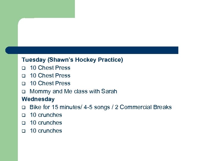 Tuesday (Shawn’s Hockey Practice) q 10 Chest Press q Mommy and Me class with Sarah Wednesday q Bike for 15 minutes/ 4 -5 songs / 2 Commercial Breaks q 10 crunches