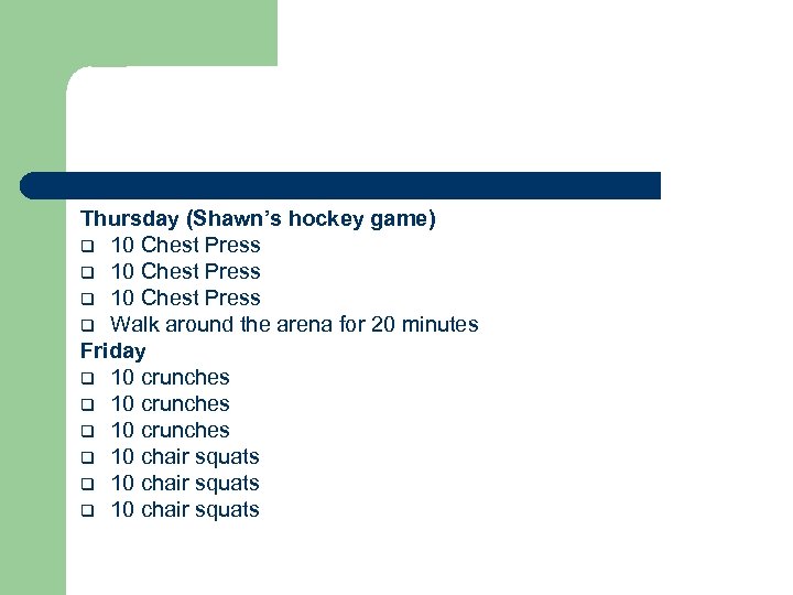Thursday (Shawn’s hockey game) q 10 Chest Press q Walk around the arena for 20 minutes Friday q 10 crunches q 10 chair squats