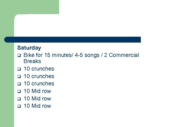 Saturday q Bike for 15 minutes/ 4 -5 songs / 2 Commercial Breaks q 10 crunches q 10 Mid row