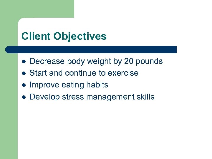 Client Objectives l l Decrease body weight by 20 pounds Start and continue to exercise Improve eating habits Develop stress management skills