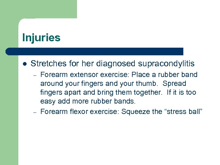 Injuries l Stretches for her diagnosed supracondylitis – – Forearm extensor exercise: Place a rubber band around your fingers and your thumb. Spread fingers apart and bring them together. If it is too easy add more rubber bands. Forearm flexor exercise: Squeeze the “stress ball”