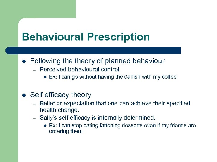 Behavioural Prescription l Following theory of planned behaviour – Perceived behavioural control l l Ex: I can go without having the danish with my coffee Self efficacy theory – – Belief or expectation that one can achieve their specified health change. Sally’s self efficacy is internally determined. l Ex: I can stop eating fattening desserts even if my friends are ordering them