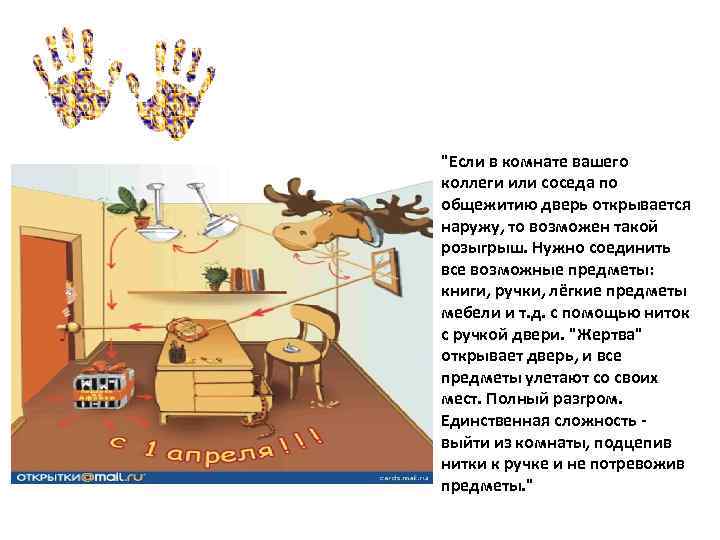 "Если в комнате вашего коллеги или соседа по общежитию дверь открывается наружу, то возможен такой розыгрыш. Нужно соединить все возможные предметы: книги, ручки, лёгкие предметы мебели и т. д. с помощью ниток с ручкой двери. "Жертва" открывает дверь, и все предметы улетают со своих мест. Полный разгром. Единственная сложность выйти из комнаты, подцепив нитки к ручке и не потревожив предметы. "