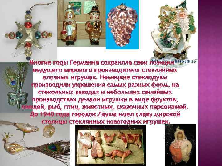 В начале ХХ Германию потеснили Богемия (Чехия), Польша, США и Япония. А затем и другие страны начали выпускать эти хрупкие и красивые изделия. Именно тогда возникла мода на разные виды игрушек и способы украшения елок.