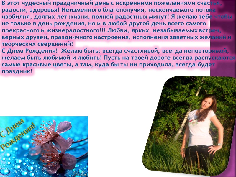 Этот день счастливый самый! День Рождения твоего! В этот день от всей души я Пожелать хочу всего! И богатства, и здоровья! И конечно же тепла! Чтобы жизнь твоя похожа На мечту всегда была!