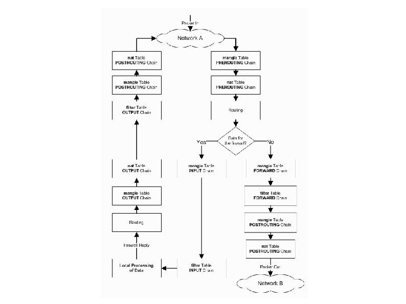 Iptables. Filter. Cadenas La tabla filter tiene predefinidas las siguientes cadenas internas: OUTPUT: iptables envia el paquete a esta cadena si el sistema local es el que genera el paquete de red. FOWARD: iptables envia el paquete a esta cadena si el paquete procede de una máquina origen y destino diferente al sistema local. Para más información ver el dibujo siguiente que ha sido recogido de: http: //www. siliconvalleyccie. com/linuxhn/iptables-intro. htm#_Toc 92808862 INPUT: iptables envia el paquete a esta cadena si el destino del paquete de red es el sistema local.