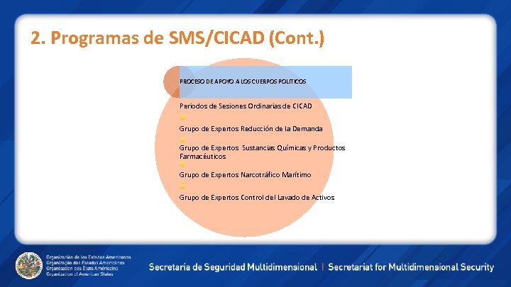 2. Programas de SMS/CICAD (Cont. ) PROCESO DE APOYO A LOS CUERPOS POLITICOS Periodos de Sesiones Ordinarias de CICAD Grupo de Expertos Reducción de la Demanda Grupo de Expertos Sustancias Químicas y Productos Farmacéuticos Grupo de Expertos Narcotráfico Marítimo Grupo de Expertos Control del Lavado de Activos