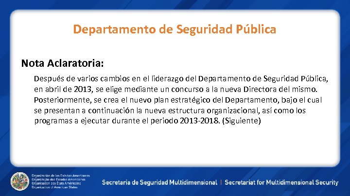 Departamento de Seguridad Pública Nota Aclaratoria: Después de varios cambios en el liderazgo del Departamento de Seguridad Pública, en abril de 2013, se elige mediante un concurso a la nueva Directora del mismo. Posteriormente, se crea el nuevo plan estratégico del Departamento, bajo el cual se presentan a continuación la nueva estructura organizacional, así como los programas a ejecutar durante el periodo 2013 -2018. (Siguiente)