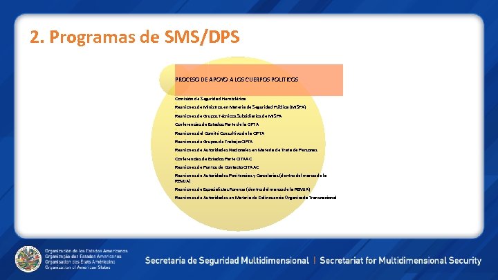 2. Programas de SMS/DPS PROCESO DE APOYO A LOS CUERPOS POLITICOS Comisión de Seguridad Hemisférica Reuniones de Ministros en Materia de Seguridad Pública (MISPA) Reuniones de Grupos Técnicos Subsidiarios de MISPA Conferencias de Estados Parte de la CIFTA Reuniones del Comité Consultivo de la CIFTA Reuniones de Grupos de Trabajo CIFTA Reuniones de Autoridades Nacionales en Materia de Trata de Personas Conferencias de Estados Parte CITAAC Reuniones de Puntos de Contacto CITAAC Reuniones de Autoridades Penitencias y Carcelarias (dentro del marco de la REMJA) Reuniones de Especialistas Forense (dentro del marco de la REMJA) Reuniones de Autoridades en Materia de Delincuencia Organizada Transnacional