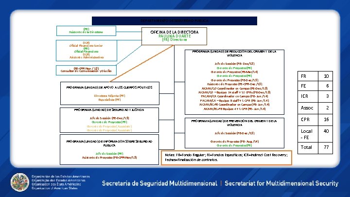 DEPARTAMENTO DE SEGURIDAD PUBLICA (FR) Asistente de la Directora (ICR) Oficial Financiero Senior (FR) Oficial Financiero (ICR) Asistente Administrativo OFICINA DE LA DIRECTORA PAULINA DUARTE (FR) Directora (FE-CPR Nov / 13) Consultor de Comunicación y Diseño PROGRAMA (UNIDAD) DE APOYO A LOS CUERPOS POLITICOS Directora Adjunta (FR) Especialista (FR) PROGRAMA (UNIDAD) DE SEGURIDAD Y JUSTICIA PROGRAMA (UNIDAD) DE REDUCCION DEL CRIMEN Y DE LA VIOLENCIA Jefe de Sección (FE- Dec/13) Gerente de Proyecto (FR) Gerente de Proyecto (FE-Mar/14) Gerente de Proyecto (FR) Gerente de Proyecto (FE-Dec /13) Asistente de Proyecto (FE-CPR-Dec /13) AICMA/CO Coordinador en Campo (FE-Dec /13) AICMA/CO – Equipo: 24 staff + 12 CPRs (FE-Dec /13) PACAM/CA Coordinador en Campo (FE- Jun /14) PACAM/CA – Equipo: 9 staff + 1 CPR (FE- Jun /14) AICMA/EC-PE Coordinador en Campo (FE- Jun /14) AICMA/EC-PE Equipo: 4 + 1 CPR (FE- Jun /14) Jefe de Sección (FE-Dec /13) Gerente de Proyecto (FR) Gerente de Proyecto (Associate) PROGRAMA (UNIDAD) DE PREVENCION DEL CRIMEN Y DE LA VIOLENCIA PROGRAMA (UNIDAD) DE INFORMACION SOBRE SEGURIDAD PUBLICA Gerente de Proyecto (FE- Aug /14) Gerente de Proyecto (FR) Jefe de Sección (FR) Asistente de Proyecto (FE-CPR-Nov/13) Jefe de Sección (FE-Dec /13) Notas: FR=Fondo Regular; FE=Fondos Específicos; ICR=Indirect Cost Recovery; Fechas=Finalización de contratos. FR 10 FE 6 ICR 3 Assoc 2 CPR 16 Local - FE 40 Total 77