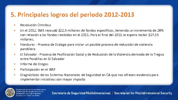 5. Principales logros del periodo 2012 -2013 Resolución Omnibus En el 2012, SMS recaudó $22. 5 millones de fondos específicos, teniendo un incremento de 28% con relación a los fondos recibidos en el 2011. Para el final del 2013 se espera recibir $27. 15 millones. Honduras - Proceso de Dialogo para iniciar un posible proceso de reducción de violencia pandillera El Salvador - Proceso de Pacificación Social y de Reducción de la Violencia derivado de la Tregua entre Pandillas en El Salvador Informe de Drogas Participación en el WEF Diagnósticos de los Sistemas Nacionales de Seguridad en CA que nos ofrecen evidencia para implementar iniciativas con mayor impacto