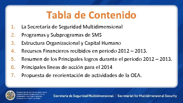 Tabla de Contenido 1. 2. 3. 4. 5. 6. 7. La Secretaría de Seguridad Multidimensional Programas y Subprogramas de SMS Estructura Organizacional y Capital Humano Recursos Financieros recibidos en periodo 2012 – 2013. Resumen de los Principales logros durante el periodo 2012 – 2013. Principales líneas de acción para el 2014 Propuesta de reorientación de actividades de la OEA.