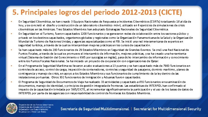 5. Principales logros del periodo 2012 -2013 (CICTE) En Seguridad Cibernética, se han creado 3 Equipos Nacionales de Respuesta a Incidentes Cibernéticos (CSIRTs) totalizando 18 al día de hoy, y se concretó el diseño y construcción de un laboratorio cibernético móvil, utilizado en 6 ejercicios de simulaciones de crisis cibernéticas en las Américas. Tres Estados Miembros han adoptado Estrategias Nacionales de Seguridad Cibernética. En Seguridad en el Turismo, fueron capacitados 1200 funcionarios y se generaron redes de colaboración entre los sectores público y privado en los destinos capacitados, organismos globales y regionales como la Organización Panamericana de la Salud y la Organización Mundial de Turismo de Naciones Unidas, y agencias especializadas como el FBI. Se inició una red interamericana de expertos en seguridad turística, a través de la cual se intercambian mejores prácticas en los cursos de capacitación. Se han capacitado más de 200 funcionarios de 29 Estados Miembros en Seguridad de Grandes Eventos. Se creó una Red Nacional de Puntos Focales, a través de la cual se promueve el intercambio de información, mejores prácticas, y se ha creado una herramienta virtual (Sistema de Gestión del Conocimiento o KMS por sus siglas en inglés), para dicho intercambio de información y conocimiento entre los Puntos Focales Nacionales. Se ha iniciado un proyecto de cooperación con organizaciones de Qatar. En el Programa de Seguridad Marítima se llevaron a cabo evaluaciones a 13 puertos y se han capacitado más de 7900 funcionarios en controles de acceso, control de carga, inspección de contenedores, controles y seguridad de pasajeros, dominio marítimo, planes de contingencia y manejo de crisis, en apoyo a los Estados Miembros y sus funcionarios de cumplimiento de la ley dentro de las instalaciones portuarias. Otros 302 funcionarios de Inmigración y Aduanas fueron capacitados. El Programa de Seguridad de Documentos de Viaje ha realizado 33 actividades y capacitado a 855 funcionarios en examinación de documentos, manejo de identidad, y principios de gestión integrada de fronteras. Las estadísticas de INTERPOL han confirmado el impacto de la capacitación brindada por SMS/CICTE, al incrementar significativamente la participación y el uso de los bases de datos de INTERPOL por parte de las agencias con responsabilidad de control de fronteras los Estados Miembros.