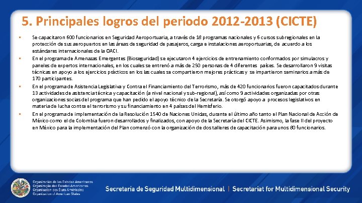 5. Principales logros del periodo 2012 -2013 (CICTE) Se capacitaron 600 funcionarios en Seguridad Aeroportuaria, a través de 18 programas nacionales y 6 cursos subregionales en la protección de sus aeropuertos en las áreas de seguridad de pasajeros, carga e instalaciones aeroportuarias, de acuerdo a los estándares internacionales de la OACI. En el programa de Amenazas Emergentes (Bioseguridad) se ejecutaron 4 ejercicios de entrenamiento conformados por simulacros y paneles de expertos internacionales, en los cuales se entrenó a más de 250 personas de 4 diferentes países. Se desarrollaron 9 visitas técnicas en apoyo a los ejercicios prácticos en los las cuales se compartieron mejores prácticas y se impartieron seminarios a más de 170 participantes. En el programa de Asistencia Legislativa y Contra el Financiamiento del Terrorismo, más de 420 funcionarios fueron capacitados durante 13 actividades de asistencia técnica y capacitación (a nivel nacional y sub-regional), así como 9 actividades organizadas por otras organizaciones socias del programa que han pedido el apoyo técnico de la Secretaría. Se otorgó apoyo a procesos legislativos en materia de lucha contra el terrorismo y su financiamiento en 4 países del Hemisferio. En el programa de implementación de la Resolución 1540 de Naciones Unidas, durante el último año tanto el Plan Nacional de Acción de México como el de Colombia fueron desarrollados y finalizados, con apoyo de la Secretaría del CICTE. Asimismo, la fase II del proyecto en México para la implementación del Plan comenzó con la organización de dos talleres de capacitación para unos 80 funcionarios.
