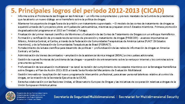 5. Principales logros del periodo 2012 -2013 (CICAD) Informe sobre el Problema de las Drogas en las Américas – un informe comprehensivo y pionero mandato de la Cumbre de presidentes que ha abierto un nuevo diálogo en el hemisferio sobre la política de drogas. Mantener los usuarios de drogas fuera de la prisión y en tratamiento supervisado. – El modelo de las cortes de tratamiento de drogas se expandió a través de 5 proyectos piloto en 4 países de Latinoamérica, mientras se preparan otros 5 Estados miembros. Primera promoción de graduados del programa en el 2013 en Trinidad y Tobago. Finalización del primer manual científico de Monitoreo y Evaluación de las Cortes de Tratamiento de Drogas con un enfoque Hemisférico. Formación y certificación de proveedores de servicios de prevención y tratamiento de drogas (PROCCER) - avances importantes en México, América Central, el Caribe, a través de la Federación de Comunidades Terapéuticas de América Latina (FLACT 19 Estados miembros), y de la Federación de Comunidades Terapéuticas de Brasil (FEBRACT). Fortalecimiento de la base científica para desarrollo de políticas – profundización de las redes de información de drogas en America Central y el Caribe. Administración de bienes decomisados – ampliación de la asistencia técnica integral (BIDAL) a cinco países adicionales. Gestión de nuevas fronteras del problema de las drogas – expansión de entrenamiento sobre la venta por internet y los controles sobre precursores químicos. Profundización de la evaluación multilateral – se lanzó la revisión del cumplimiento de los estados miembros con la Estrategia Hemisférica sobre Drogas y el Plan de Acción 2011 -2015 a través Sexta Ronda del Mecanismo de Evaluación Multilateral. Gestión innovadora - la aplicación del nuevo programa de intercambio profesional, para atraer personal talentoso relativo al control de drogas, en la rotación de la Secretaría Ejecutiva de la CICAD. Estrecha colaboración con las Naciones Unidas, el Observatorio Europeo de Drogas y las iniciativas de cooperación relativas a drogas de la Unión Europea en América Latina.