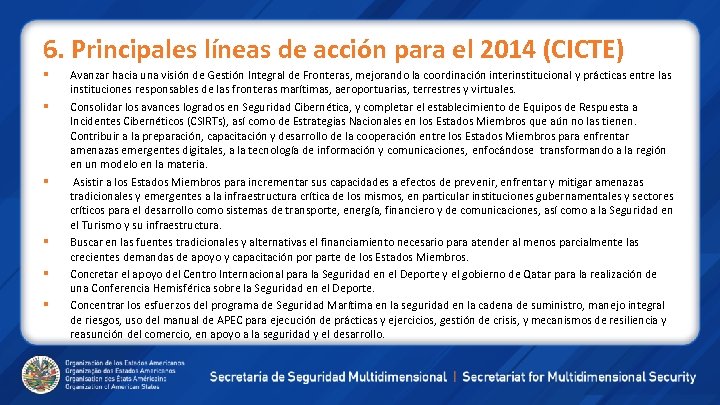 6. Principales líneas de acción para el 2014 (CICTE) Avanzar hacia una visión de Gestión Integral de Fronteras, mejorando la coordinación interinstitucional y prácticas entre las instituciones responsables de las fronteras marítimas, aeroportuarias, terrestres y virtuales. Consolidar los avances logrados en Seguridad Cibernética, y completar el establecimiento de Equipos de Respuesta a Incidentes Cibernéticos (CSIRTs), así como de Estrategias Nacionales en los Estados Miembros que aún no las tienen. Contribuir a la preparación, capacitación y desarrollo de la cooperación entre los Estados Miembros para enfrentar amenazas emergentes digitales, a la tecnología de información y comunicaciones, enfocándose transformando a la región en un modelo en la materia. Asistir a los Estados Miembros para incrementar sus capacidades a efectos de prevenir, enfrentar y mitigar amenazas tradicionales y emergentes a la infraestructura crítica de los mismos, en particular instituciones gubernamentales y sectores críticos para el desarrollo como sistemas de transporte, energía, financiero y de comunicaciones, así como a la Seguridad en el Turismo y su infraestructura. Buscar en las fuentes tradicionales y alternativas el financiamiento necesario para atender al menos parcialmente las crecientes demandas de apoyo y capacitación por parte de los Estados Miembros. Concretar el apoyo del Centro Internacional para la Seguridad en el Deporte y el gobierno de Qatar para la realización de una Conferencia Hemisférica sobre la Seguridad en el Deporte. Concentrar los esfuerzos del programa de Seguridad Marítima en la seguridad en la cadena de suministro, manejo integral de riesgos, uso del manual de APEC para ejecución de prácticas y ejercicios, gestión de crisis, y mecanismos de resiliencia y reasunción del comercio, en apoyo a la seguridad y el desarrollo.