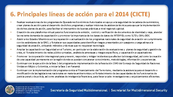 6. Principales líneas de acción para el 2014 (CICTE) Realizar evaluaciones de los programas de Operadores Económicos Autorizados en apoyo a la seguridad de la cadena de suministros, crear planes de acción para el desarrollo de dichos programas y realizar misiones de asistencia técnica para apoyar la implementación de dichos planes de acción, para facilitar el intercambio de buenas prácticas a nivel regional y global. Creación de una plataforma virtual para los funcionarios de emisión, control y verificación de documentos de identidad y viaje, atender la creciente demanda de capacitación y promover la importancia de los bases de datos de INTERPOL como SLTD y DIAL-DOC. Asistir a los Estados Miembros en la preparación o actualización de los programas nacionales de seguridad de aviación en cumplimiento con los estándares de la OACI, y fortalecer sus capacidades para identificar riesgos presentados por pasajeros y carga aérea a la seguridad de aviación, utilizando métodos y técnicas que no requieran tecnología. Ampliar la capacitación en Seguridad en el Turismo, en particular en la elaboración de evaluaciones y planes de seguridad y gestión de crisis, el fortalecimiento de redes público-privadas , análisis de amenazas y riesgos específicos, y capacitación a capacitadores. Promover la cooperación interregional para prevenir, responder y mitigar incidentes que afecten la bioseguridad, así como la creación de una capacidad permanente en la región donde se puedan concatenar conocimiento, metodologías, información y experiencias. Continuar con la ejecución de la fase 2 del programa de implementación de la Resolución 1540 del Consejo de Seguridad de Naciones Unidas en Méjico y Colombia, e iniciar la fase 1 en Panamá. Continuar con la implementación del programa contra el Financiamiento del Terrorismo, mediante la asistencia para el desarrollo o modificación de las legislaciones nacionales en materia antiterrorista y el fortalecimiento de las capacidades de los funcionarios de justicia penal y de policía, así como analistas de inteligencia financiera, para llevar a cabo investigaciones y enjuiciamientos eficientes.