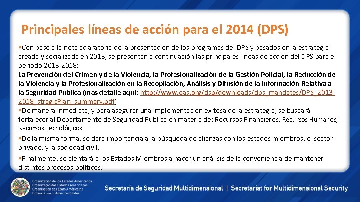 Principales líneas de acción para el 2014 (DPS) Con base a la nota aclaratoria de la presentación de los programas del DPS y basados en la estrategia creada y socializada en 2013, se presentan a continuación las principales líneas de acción del DPS para el periodo 2013 -2018: La Prevención del Crimen y de la Violencia, la Profesionalización de la Gestión Policial, la Reducción de la Violencia y la Profesionalización en la Recopilación, Análisis y Difusión de la Información Relativa a la Seguridad Publica (mas detalle aquí: http: //www. oas. org/dsp/downloads/dps_mandates/DPS_20132018_stragic. Plan_summary. pdf) De manera inmediata, y para asegurar una implementación exitosa de la estrategia, se buscará fortalecer al Departamento de Seguridad Pública en materia de: Recursos Financieros, Recursos Humanos, Recursos Tecnológicos. De la misma forma, se dará importancia a la búsqueda de alianzas con los estados miembros, el sector privado, y la sociedad civil. Finalmente, se alentará a los Estados Miembros a hacer un análisis de la conveniencia de mantener distintos procesos políticos.