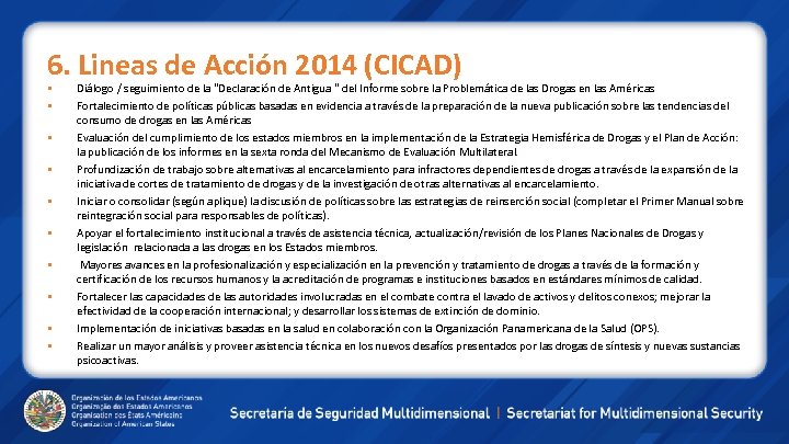 6. Lineas de Acción 2014 (CICAD) Diálogo / seguimiento de la "Declaración de Antigua " del Informe sobre la Problemática de las Drogas en las Américas Fortalecimiento de políticas públicas basadas en evidencia a través de la preparación de la nueva publicación sobre las tendencias del consumo de drogas en las Américas Evaluación del cumplimiento de los estados miembros en la implementación de la Estrategia Hemisférica de Drogas y el Plan de Acción: la publicación de los informes en la sexta ronda del Mecanismo de Evaluación Multilateral. Profundización de trabajo sobre alternativas al encarcelamiento para infractores dependientes de drogas a través de la expansión de la iniciativa de cortes de tratamiento de drogas y de la investigación de otras alternativas al encarcelamiento. Iniciar o consolidar (según aplique) la discusión de políticas sobre las estrategias de reinserción social (completar el Primer Manual sobre reintegración social para responsables de políticas). Apoyar el fortalecimiento institucional a través de asistencia técnica, actualización/revisión de los Planes Nacionales de Drogas y legislación relacionada a las drogas en los Estados miembros. Mayores avances en la profesionalización y especialización en la prevención y tratamiento de drogas a través de la formación y certificación de los recursos humanos y la acreditación de programas e instituciones basados en estándares mínimos de calidad. Fortalecer las capacidades de las autoridades involucradas en el combate contra el lavado de activos y delitos conexos; mejorar la efectividad de la cooperación internacional; y desarrollar los sistemas de extinción de dominio. Implementación de iniciativas basadas en la salud en colaboración con la Organización Panamericana de la Salud (OPS). Realizar un mayor análisis y proveer asistencia técnica en los nuevos desafíos presentados por las drogas de síntesis y nuevas sustancias psicoactivas.