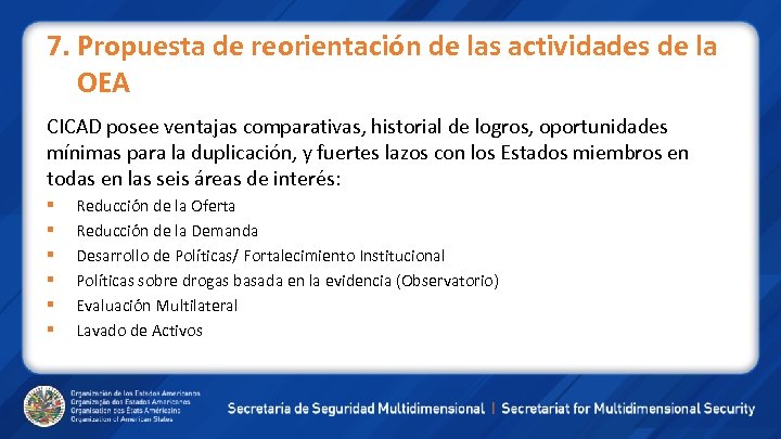 7. Propuesta de reorientación de las actividades de la OEA CICAD posee ventajas comparativas, historial de logros, oportunidades mínimas para la duplicación, y fuertes lazos con los Estados miembros en todas en las seis áreas de interés: Reducción de la Oferta Reducción de la Demanda Desarrollo de Políticas/ Fortalecimiento Institucional Políticas sobre drogas basada en la evidencia (Observatorio) Evaluación Multilateral Lavado de Activos