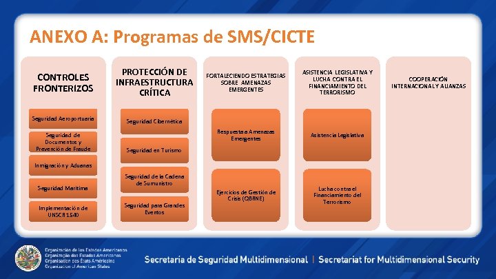 ANEXO A: Programas de SMS/CICTE CONTROLES FRONTERIZOS PROTECCIÓN DE INFRAESTRUCTURA CRÍTICA Seguridad Aeroportuaria Seguridad Cibernética Seguridad de Documentos y Prevención de Fraude FORTALECIENDO ESTRATEGIAS SOBRE AMENAZAS EMERGENTES ASISTENCIA LEGISLATIVA Y LUCHA CONTRA EL FINANCIAMIENTO DEL TERRORISMO Respuesta a Amenazas Emergentes Asistencia Legislativa Ejercicios de Gestión de Crisis (QBRNE) Lucha contra el Financiamiento del Terrorismo Seguridad en Turismo Inmigración y Aduanas Seguridad Marítima Implementación de UNSCR 1540 Seguridad de la Cadena de Sumunistro Seguridad para Grandes Eventos COOPERACIÓN INTERNACIONAL Y ALIANZAS