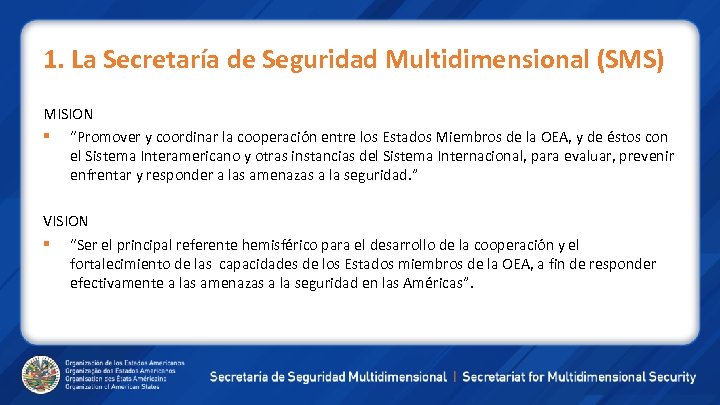 1. La Secretaría de Seguridad Multidimensional (SMS) MISION “Promover y coordinar la cooperación entre los Estados Miembros de la OEA, y de éstos con el Sistema Interamericano y otras instancias del Sistema Internacional, para evaluar, prevenir enfrentar y responder a las amenazas a la seguridad. ” VISION “Ser el principal referente hemisférico para el desarrollo de la cooperación y el fortalecimiento de las capacidades de los Estados miembros de la OEA, a fin de responder efectivamente a las amenazas a la seguridad en las Américas”.