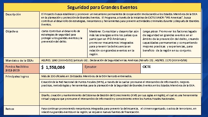 Seguridad para Grandes Eventos Descripción El Proyecto busca establecer y promover un mecanismo permanente de cooperación involucrando a los Estados Miembros de la OEA en la planeación y protección de Grandes Eventos. El Programa, a través de la iniciativa de CICTE/UNICRI “IPO Americas”, busca contribuir al desarrollo de estrategias, mecanismos y herramientas para prevenir actividades criminales durante y después de Grandes Eventos. Objetivos Corto: Contribuir al desarrollo de estrategias de seguridad para proteger a los grandes eventos y la prevención delito. Mandatos de la OEA: AG/RES. 1840 (XXXII-O/02) (articulo 16) ; Declaración de Seguridad en las Américas (Párrafo 23) ; AG/RES. 2170 (XXXVI-O/06) Fondos Recibidos 2012 -2013 $ 1, 558, 066 Principales logros Más de 200 oficiales en 29 Estados Miembros de la OEA han sido entrenados. Mediano: Consolidar y desarrollar aún más las sinergias entre los países que participan en IPO Américas y promover mecanismos integrados para prevenir la delincuencia en relación con grandes eventos en la región. Ejecutor: Largo plazo: Promover los factores legado de seguridad en grandes eventos en el ámbito de la prevención delito, creando capacidades permanentes y compartiendo mejores practicas y experiencias, para beneficio de la región en su conjunto. CICTE Creación de la Red Nacional de Puntos Focales (NFPs), a través de la cual se promueve el intercambio de información, mejores practicas, metodologías y herramientas para la planeación de la Seguridad de Grandes Eventos en los Estados Miembros de la OEA. Diseño, creación y mantenimiento del Sistema de Gestión del Conocimiento (KMS por sus siglas en inglés), el cual es una herramienta virtual y segura que promueve el intercambio de información y conocimiento entre los Puntos Focales Nacionales. Retos: Para continuar promoviendo mecanismos integrados para prevenir la delincuencia, el crimen organizado, o actos de terrorismo, en relación a grandes eventos en la región, se requiere nuevas fuentes de financiación.