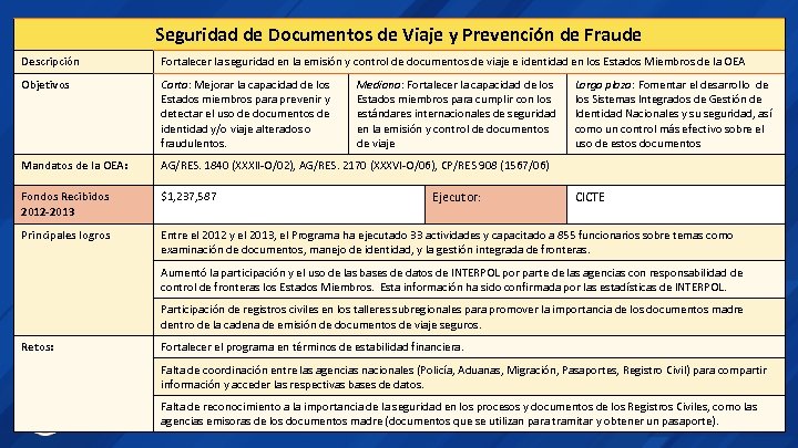 Seguridad de Documentos de Viaje y Prevención de Fraude Descripción Fortalecer la seguridad en la emisión y control de documentos de viaje e identidad en los Estados Miembros de la OEA Objetivos Corto: Mejorar la capacidad de los Estados miembros para prevenir y detectar el uso de documentos de identidad y/o viaje alterados o fraudulentos. Mandatos de la OEA: AG/RES. 1840 (XXXII-O/02), AG/RES. 2170 (XXXVI-O/06), CP/RES 908 (1567/06) Fondos Recibidos 2012 -2013 $1, 237, 587 Principales logros Entre el 2012 y el 2013, el Programa ha ejecutado 33 actividades y capacitado a 855 funcionarios sobre temas como examinación de documentos, manejo de identidad, y la gestión integrada de fronteras. Mediano: Fortalecer la capacidad de los Estados miembros para cumplir con los estándares internacionales de seguridad en la emisión y control de documentos de viaje Ejecutor: Largo plazo: Fomentar el desarrollo de los Sistemas Integrados de Gestión de Identidad Nacionales y su seguridad, así como un control más efectivo sobre el uso de estos documentos CICTE Aumentó la participación y el uso de las bases de datos de INTERPOL por parte de las agencias con responsabilidad de control de fronteras los Estados Miembros. Esta información ha sido confirmada por las estadísticas de INTERPOL. Participación de registros civiles en los talleres subregionales para promover la importancia de los documentos madre dentro de la cadena de emisión de documentos de viaje seguros. Retos: Fortalecer el programa en términos de estabilidad financiera. Falta de coordinación entre las agencias nacionales (Policía, Aduanas, Migración, Pasaportes, Registro Civil) para compartir información y acceder las respectivas bases de datos. Falta de reconocimiento a la importancia de la seguridad en los procesos y documentos de los Registros Civiles, como las agencias emisoras de los documentos madre (documentos que se utilizan para tramitar y obtener un pasaporte).