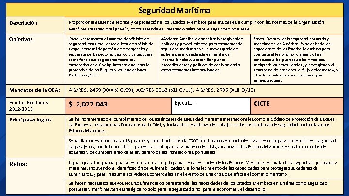 Seguridad Marítima Descripción Proporcionar asistencia técnica y capacitación a los Estados Miembros para ayudarles a cumplir con las normas de la Organización Marítima Internacional (OMI) y otros estándares internacionales para la seguridad portuaria. Objetivos Corto: Incrementar el número de oficiales de seguridad marítima, especialistas de análisis de riesgo, personal de gestión de emergencias y respuesta de los sectores público y privado, así como funcionarios gubernamentales, entrenados en el Código Internacional para la protección de los Buques y las Instalaciones Portuarias (ISPS). Mandatos de la OEA: AG/RES. 2459 (XXXIX-O/09); AG/RES. 2618 (XLI-O/11); AG/RES. 2735 (XLII-O/12) Fondos Recibidos 2012 -2013 $ 2, 027, 043 Principales logros Se ha incrementado el cumplimiento de los estándares de seguridad marítima internacionales como el Código de Protección de Buques e Instalaciones Portuarias de la OMI, y fortalecido relaciones de trabajo con las instituciones de seguridad portuaria en los Estados Miembros. Mediano: Ampliar la armonización regional de políticas y procedimientos para estándares de seguridad marítima con un mayor grado de adherencia a los estándares marítimos internacionales, y desarrollar planes, procedimientos y políticas de conformidad a estos estándares internacionales. Ejecutor: Largo: Desarrollar la seguridad portuaria y marítima en las Américas, fortaleciendo las capacidades de los Estados Miembros para combatir el terrorismo, crimen y otras amenazas a los puertos de las Américas, mitigando vulnerabilidades , y protegiendo el transporte de pasajeros, el flujo del comercio, y el sistema internacional marítimo y su infraestructura. CICTE Se realizaron evaluaciones a 13 puertos y capacitado más de 7900 funcionarios en controles de acceso, carga y contenedores, seguridad de pasajeros, dominio marítimo , planes de contingencia y manejo de crisis, en apoyo a los Estados Miembros y sus funcionarios de aduanas y de cumplimiento de la ley dentro de las instalaciones portuarias. Retos: Lograr que el programa pueda responder a la amplia gama de necesidades de los Estados Miembros en materia de seguridad portuaria y marítima, incluyendo la identificación de vulnerabilidades y el fortalecimiento de las capacidades para proteger sus cadenas de suministros, y para reasumir actividades comerciales en el evento de una crisis que afecte el dominio marítimo. Se hacen necesarios nuevos recursos financieros para atender las necesidades de los Estados Miembros en un área como seguridad portuaria y marítima, tan estratégica no solo para la seguridad sino para la economía y el desarrollo.