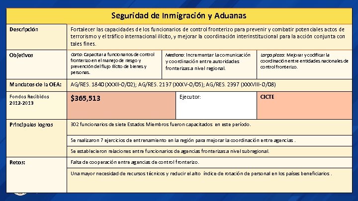 Seguridad de Inmigración y Aduanas Descripción Fortalecer las capacidades de los funcionarios de control fronterizo para prevenir y combatir potenciales actos de terrorismo y el tráfico internacional ilícito, y mejorar la coordinación interinstitucional para la acción conjunta con tales fines. Objetivos Corto: Capacitar a funcionarios de control fronterizo en el manejo de riesgo y prevención del flujo ilícito de bienes y personas. Mandatos de la OEA: AG/RES. 1840 (XXXII-O/02); AG/RES. 2137 (XXXV-O/05); AG/RES. 2397 (XXXVIII-O/08) Fondos Recibidos 2012 -2013 $365, 513 Principales logros 302 funcionarios de siete Estados Miembros fueron capacitados en este período. Mediano: Incrementar la comunicación y coordinación entre autoridades fronterizas a nivel regional. Ejecutor: Largo plazo: Mejorar y codificar la coordinación entre entidades nacionales de control fronterizo. CICTE Se realizaron 7 ejercicios de entrenamiento en la región para mejorar la coordinación entre agencias. Se establecieron relaciones entre funcionarios de agencias fronterizas a nivel subregional. Retos: Falta de cooperación entre agencias de control fronterizo. Una mayor necesidad de recursos técnicos y reducir el alto índice de rotación de personal en los países beneficiarios.