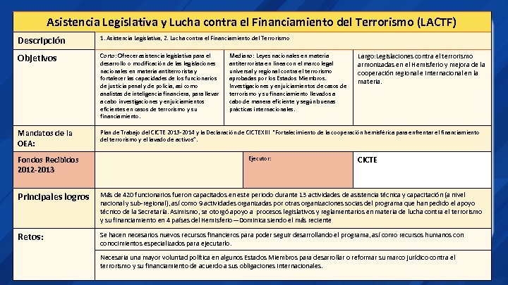 Asistencia Legislativa y Lucha contra el Financiamiento del Terrorismo (LACTF) Descripción 1. Asistencia Legislativa, 2. Lucha contra el Financiamiento del Terrorismo Objetivos Corto: Ofrecer asistencia legislativa para el desarrollo o modificación de las legislaciones nacionales en materia antiterrorista y fortalecer las capacidades de los funcionarios de justicia penal y de policía, así como analistas de inteligencia financiera, para llevar a cabo investigaciones y enjuiciamientos eficientes en casos de terrorismo y su financiamiento. Mandatos de la OEA: Plan de Trabajo del CICTE 2013 -2014 y la Declaración de CICTE XIII “Fortalecimiento de la cooperación hemisférica para enfrentar el financiamiento del terrorismo y el lavado de activos”. Fondos Recibidos 2012 -2013 Mediano: Leyes nacionales en materia antiterrorista en línea con el marco legal universal y regional contra el terrorismo aprobadas por los Estados Miembros. Investigaciones y enjuiciamientos de casos de terrorismo y su financiamiento llevados a cabo de manera eficiente y según buenas prácticas internacionales. Ejecutor: Largo: Legislaciones contra el terrorismo armonizadas en el Hemisferio y mejora de la cooperación regional e internacional en la materia. CICTE Principales logros Más de 420 funcionarios fueron capacitados en este periodo durante 13 actividades de asistencia técnica y capacitación (a nivel nacional y sub-regional), así como 9 actividades organizadas por otras organizaciones socias del programa que han pedido el apoyo técnico de la Secretaría. Asimismo, se otorgó apoyo a procesos legislativos y reglamentarios en materia de lucha contra el terrorismo y su financiamiento en 4 países del Hemisferio—Dominica siendo el más reciente Retos: Se hacen necesarios nuevos recursos financieros para poder seguir desarrollando el programa, así como recursos humanos conocimientos especializados para ejecutarlo. Necesaria una mayor voluntad política en algunos Estados Miembros para desarrollar o reformar su marco jurídico contra el terrorismo y su financiamiento de acuerdo a sus obligaciones internacionales.