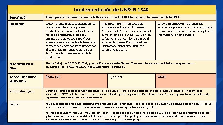 Implementación de UNSCR 1540 Descripción Apoyo para la implementación de la Resolución 1540 (2004) del Consejo de Seguridad de la ONU Objetivos Corto: Fortalecer las capacidades de los Estados Miembros para prevenir, combatir y reaccionar contra el uso de materiales nucleares, biológicos, químicos o radiológicos (NBQR) por actores no estatales, sobre la base de las necesidades y desafíos identificados por ellos mismos en Planes Nacionales de Acción para la Implementación de la UNSCR 1540. Mandatos de la OEA: Plan de Trabajo del CICTE 2013 -2014, y resolución de la Asamblea General “Avanzando la seguridad hemisférica: una aproximación multidimensional” [AGAG/RES. 2735 (XLII-O/12)]: Párrafo operativo 31. Fondos Recibidos 2012 -2013 $236, 124 Principales logros Durante el último año tanto el Plan Nacional de Acción de México como el de Colombia fueron desarrollados y finalizados, con apoyo de la Secretaría del CICTE. Asimismo, la fase II del proyecto en México para la implementación del Plan comenzó con la organización de dos talleres de capacitación para unos 80 funcionarios mexicanos. Retos: Para poder ejecutar la fase II del programa (implementación de los Planes de Acción Nacionales) en México y Colombia, se hacen necesarios nuevos recursos financieros, así como recursos humanos conocimientos especializados para ejecutarlo. Mediano: Implementar todas las actividades incluidas en los Planes Nacionales de Acción, mejorando así el cumplimiento de la UNSCR 1540 en los países beneficiarios y fortaleciendo el sistema de prevención contra el uso indebido de materiales NBQR por actores no estatales. Ejecutor: Largo: Armonización regional de los sistemas de prevención en materia NBQR y fortalecimiento de la cooperación regional e internacional en esta materia. CICTE Voluntad política de México y Colombia, así como de otros países que pudieran ser beneficiarios en 2014 del programa, debe reafirmarse por sus gobiernos a través del apoyo decidido a la dotación de recursos para el proyecto y de la superación de dificultades de coordinación con otros actores participantes en el programa (por ejemplo, donantes y socios estratégicos).