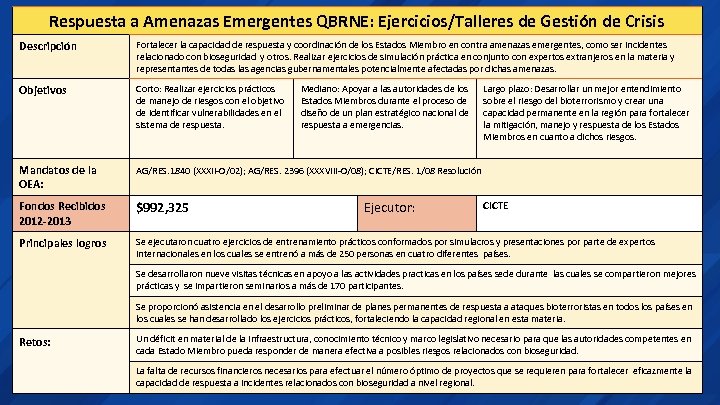 Respuesta a Amenazas Emergentes QBRNE: Ejercicios/Talleres de Gestión de Crisis Descripción Fortalecer la capacidad de respuesta y coordinación de los Estados Miembro en contra amenazas emergentes, como ser incidentes relacionado con bioseguridad y otros. Realizar ejercicios de simulación práctica en conjunto con expertos extranjeros en la materia y representantes de todas las agencias gubernamentales potencialmente afectadas por dichas amenazas. Objetivos Corto: Realizar ejercicios prácticos de manejo de riesgos con el objetivo de identificar vulnerabilidades en el sistema de respuesta. Mandatos de la OEA: AG/RES. 1840 (XXXII-O/02); AG/RES. 2396 (XXXVIII-O/08); CICTE/RES. 1/08 Resolución Fondos Recibidos 2012 -2013 $992, 325 Principales logros Se ejecutaron cuatro ejercicios de entrenamiento prácticos conformados por simulacros y presentaciones por parte de expertos internacionales en los cuales se entrenó a más de 250 personas en cuatro diferentes países. Mediano: Apoyar a las autoridades de los Estados Miembros durante el proceso de diseño de un plan estratégico nacional de respuesta a emergencias. Ejecutor: Largo plazo: Desarrollar un mejor entendimiento sobre el riesgo del bioterrorismo y crear una capacidad permanente en la región para fortalecer la mitigación, manejo y respuesta de los Estados Miembros en cuanto a dichos riesgos. CICTE Se desarrollaron nueve visitas técnicas en apoyo a las actividades practicas en los países sede durante las cuales se compartieron mejores prácticas y se impartieron seminarios a más de 170 participantes. Se proporcionó asistencia en el desarrollo preliminar de planes permanentes de respuesta a ataques bioterroristas en todos los países en los cuales se han desarrollado los ejercicios prácticos, fortaleciendo la capacidad regional en esta materia. Retos: Un déficit en material de la infraestructura, conocimiento técnico y marco legislativo necesario para que las autoridades competentes en cada Estado Miembro pueda responder de manera efectiva a posibles riesgos relacionados con bioseguridad. La falta de recursos financieros necesarios para efectuar el número óptimo de proyectos que se requieren para fortalecer eficazmente la capacidad de respuesta a incidentes relacionados con bioseguridad a nivel regional.