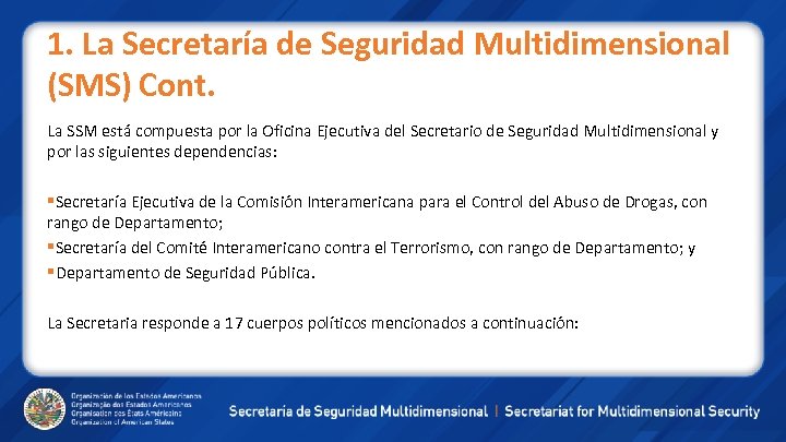 1. La Secretaría de Seguridad Multidimensional (SMS) Cont. La SSM está compuesta por la Oficina Ejecutiva del Secretario de Seguridad Multidimensional y por las siguientes dependencias: Secretaría Ejecutiva de la Comisión Interamericana para el Control del Abuso de Drogas, con rango de Departamento; Secretaría del Comité Interamericano contra el Terrorismo, con rango de Departamento; y Departamento de Seguridad Pública. La Secretaria responde a 17 cuerpos políticos mencionados a continuación: