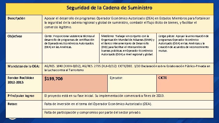 Seguridad de la Cadena de Suministro Descripción Apoyar el desarrollo de programas Operador Económico Autorizado (OEA) en Estados Miembros para fortalecer la seguridad de la cadena regional y global de suministro, combatir el flujo ilícito de bienes, y facilitar el comercio legítimo. Objetivos Corto: Proporcionar asistencia técnica al Mandatos de la OEA: AG/RES. 1840 (XXXII-O/02), AG/RES. 2735 (XLII-O/12): CICTE/DEC. 1/10 Declaración sobre Colaboración Público-Privada en la Lucha contra el Terrorismo Fondos Recibidos 2012 -2013 $199, 706 Principales logros El proyecto está en su fase inicial. Su implementación comenzará a fines de 2013. Retos: Falta de inversión en el tema del Operador Económico Autorizado (OEA). desarrollo de programas de certificación de Operadores Económicos Autorizados (OEA) en las Américas. Mediano: Trabajar en conjunto con la Organización Mundial de Aduanas (OMA) y el Banco Interamericano de Desarrollo (BID) para facilitar el intercambio de buenas prácticas en Operador Económico Autorizado (OEA) a nivel regional y global. Ejecutor: Falta de participación y compromiso por parte del sector privado. Largo plazo: Apoyar la armonización de programas Operador Económico Autorizado (OEA) en las Américas y la creación de acuerdos de reconocimiento mutuo. CICTE