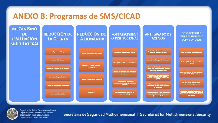 ANEXO B: Programas de SMS/CICAD MECANISMO DE EVALUACION MULTILATERAL REDUCCION DE LA OFERTA REDUCCION DE LA DEMANDA Inteligencia Antidrogas Sistemas Integrales de Prevención FORTALECIMIENT O INSTITUCIONAL ANTI-LAVADO DE ACTIVOS OBSERVATORIO INTERAMERICANO SOBRE DROGAS Políticas Nacionales sobre Drogas Capacitación sobre Lavado de Activos para Operadores Judiciales Redes de Información sobre drogas Control de Químicos Unidades de Inteligencia Financiera SAVIA (Salud y Vida en Las Américas) Control del Narcotráfico en Fronteras Estándares y protocolos para tratamiento Tribunales de tratamiento como alternativa al encarcelamiento para infractores dependientes de drogas Control de Drogas Sintéticas Cocaínas Fumables en el Cono Sur La reinserción de infractores dependientes de drogas, reduciendo la brecha Control de Productos Farmacéuticos PROCCER Control del Narcotráfico Legislación sobre Drogas en las Américas (LEDA) Entrenamiento sobre Lavado de Activos para Organismos encargados del Cumplimiento de la Ley Fortalecimiento de los sistemas nacionales de investi. patrimonial, admin. de bienes incautados y decomisados en América Latina(BIDAL) Mantenimiento, protección y disposición de activos incautados y decomisados. Centro Regional de Capacitación para el Control del Lavado de Activos (Programa Perú) Red de Epidemiología en América Latina Sistema Interamericano de Datos del Consumo de Drogas (SIDUC) Alianzas con Universidades en América Latina y el Caribe Programa Internacional de Fortalecimiento de Capacidades de Investigación sobre el tema de Drogas para profesionales relacionados con el área de salud