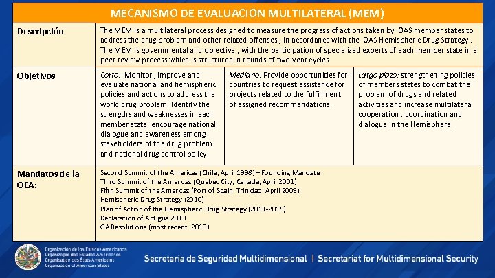 MECANISMO DE EVALUACION MULTILATERAL (MEM) Descripción The MEM is a multilateral process designed to measure the progress of actions taken by OAS member states to address the drug problem and other related offenses , in accordance with the OAS Hemispheric Drug Strategy. The MEM is governmental and objective , with the participation of specialized experts of each member state in a peer review process which is structured in rounds of two-year cycles. Objetivos Corto: Monitor , improve and evaluate national and hemispheric policies and actions to address the world drug problem. Identify the strengths and weaknesses in each member state, encourage national dialogue and awareness among stakeholders of the drug problem and national drug control policy. Mandatos de la OEA: Second Summit of the Americas (Chile, April 1998) – Founding Mandate Third Summit of the Americas (Quebec City, Canada, April 2001) Fifth Summit of the Americas (Port of Spain, Trinidad, April 2009) Hemispheric Drug Strategy (2010) Plan of Action of the Hemispheric Drug Strategy (2011 -2015) Declaration of Antigua 2013 GA Resolutions (most recent : 2013) Mediano: Provide opportunities for countries to request assistance for projects related to the fulfillment of assigned recommendations. Largo plazo: strengthening policies of members states to combat the problem of drugs and related activities and increase multilateral cooperation , coordination and dialogue in the Hemisphere.