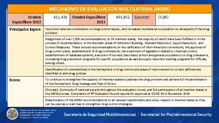 MECANISMO DE EVALUACION MULTILATERAL (MEM) Fondos Específicos 2012 Principales logros 411, 436 Fondos Específicos 2013 496, 852 Ejecutor: CICAD Improved national coordination on drug control issues , and increased multilateral cooperation on all aspects of the drug problem. Assignment of over 2, 000 recommendations, to 34 member states, the majority of which have been fulfilled or in the process of implementation, in thematic areas of Institution Building, Demand Reduction, Supply Reduction, and Control Measures. These include recommendations on the ratification of Inter-American conventions, the approval of drug control plans, establishment of drug commissions, the enactment of legislation related to chemical control, establishment of database systems, execution of surveys (secondary school and general population) on drug prevalence, increasing drug prevention programs for specific populations as well as supply reduction training programs for officials, among others. Identification of vulnerabilities in the hemisphere in drug control and areas of improvement to correct deficiencies identified in anti-drug policies. Retos: To continue to strengthen the capacity of member states to address the drug problem and achieve full implementation of the Hemispheric Drug Strategy and Plan of Action. (Process): Continuity of national experts throughout the evaluation round, and full participation of all member states in the MEM process. Completion of 6 th Evaluation Round reports for approval at CICAD 56 in November 2014. Dissemination of the MEM recommendations to all relevant stakeholders and policy makers in member states so they can be used as a road map to strengthen drug control strategies.