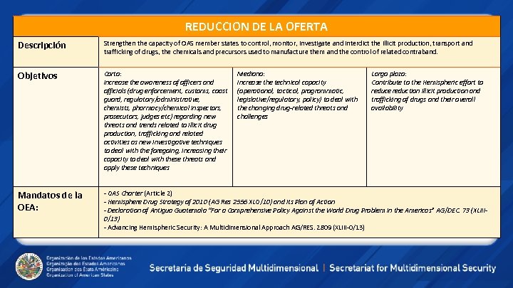 REDUCCION DE LA OFERTA Descripción Strengthen the capacity of OAS member states to control, monitor, investigate and interdict the illicit production, transport and trafficking of drugs, the chemicals and precursors used to manufacture them and the control of related contraband. Objetivos Corto: Increase the awareness of officers and officials (drug enforcement, customs, coast guard, regulatory/administrative, chemists, pharmacy/chemical inspectors, prosecutors, judges etc) regarding new threats and trends related to illicit drug production, trafficking and related activities as new investigative techniques to deal with the foregoing, increasing their capacity to deal with these threats and apply these techniques Mandatos de la OEA: - OAS Charter (Article 2) - Hemisphere Drug Strategy of 2010 (AG Res 2556 XLO/10) and its Plan of Action - Declaration of Antigua Guatemala “For a Comprehensive Policy Against the World Drug Problem in the Americas” AG/DEC. 73 (XLIII 0/13) - Advancing Hemispheric Security: A Multidimensional Approach AG/RES. 2809 (XLIII-0/13) Mediano: Increase the technical capacity (operational, tactical, programmatic, legislative/regulatory, policy) to deal with the changing drug-related threats and challenges Largo plazo: Contribute to the Hemispheric effort to reduce reduction illicit production and trafficking of drugs and their overall availability