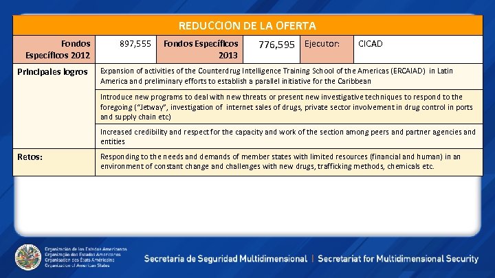 REDUCCION DE LA OFERTA Fondos Específicos 2012 Principales logros 897, 555 Fondos Específicos 2013 776, 595 Ejecutor: CICAD Expansion of activities of the Counterdrug Intelligence Training School of the Americas (ERCAIAD) in Latin America and preliminary efforts to establish a parallel initiative for the Caribbean Introduce new programs to deal with new threats or present new investigative techniques to respond to the foregoing (“Jetway”, investigation of internet sales of drugs, private sector involvement in drug control in ports and supply chain etc) Increased credibility and respect for the capacity and work of the section among peers and partner agencies and entities Retos: Responding to the needs and demands of member states with limited resources (financial and human) in an environment of constant change and challenges with new drugs, trafficking methods, chemicals etc.